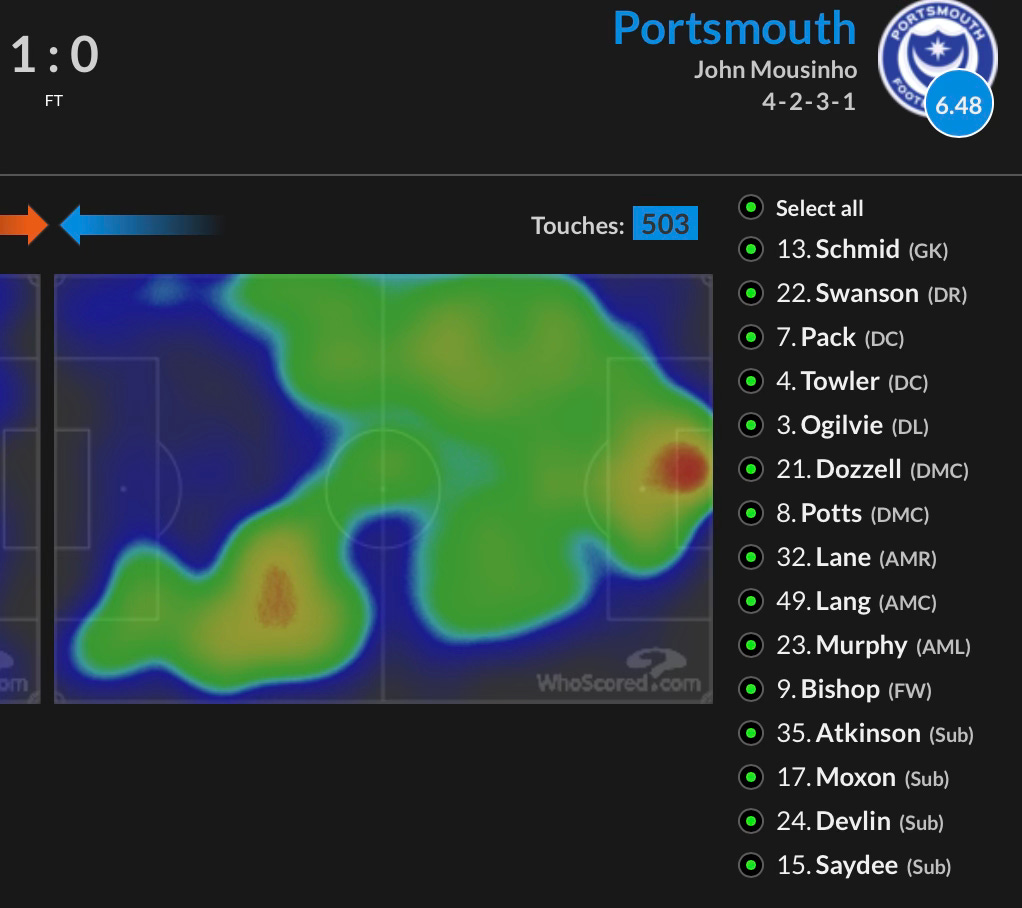 Defeat at Sunderland won’t have come as a surprise to many given Sunderland’s position in the league. However, Portsmouth gave a good account of themselves despite being reduced to 10 men in the second-half. The heatmap reaffirms Pompey’s preference to attack down the left flank where Murphy (30 touches in the final third) and Ogilvie (11 touches in the final third) were particularly effective.