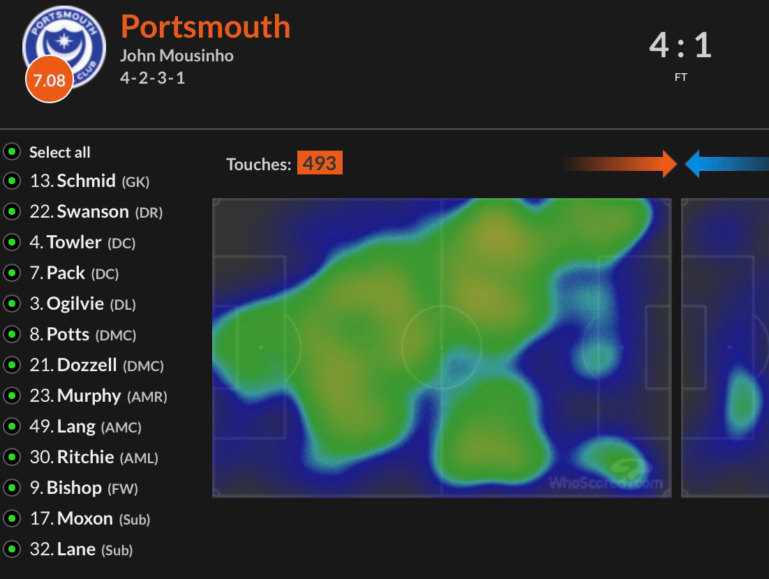 Only in this match and in the 4-0 home win against Swansea City do green patches of heat emerge in and around the central area on the edge of the penalty box. This is significant as Pompey’s attacking players, Lang and Bishop, were able to get on the ball in dangerous areas. As a result, Callum Lang scored four times in a resounding win live on television.