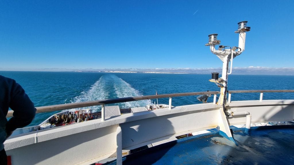 We’ve arrived in Dover ‘well-early’ after leaving my house at 6.15 for a midday ferry crossing. Darren is driving, and I’m grateful for that. He has a smart BMW, and I mess around a lot with the heated seats on the way, as we listen to the 90s football podcast.