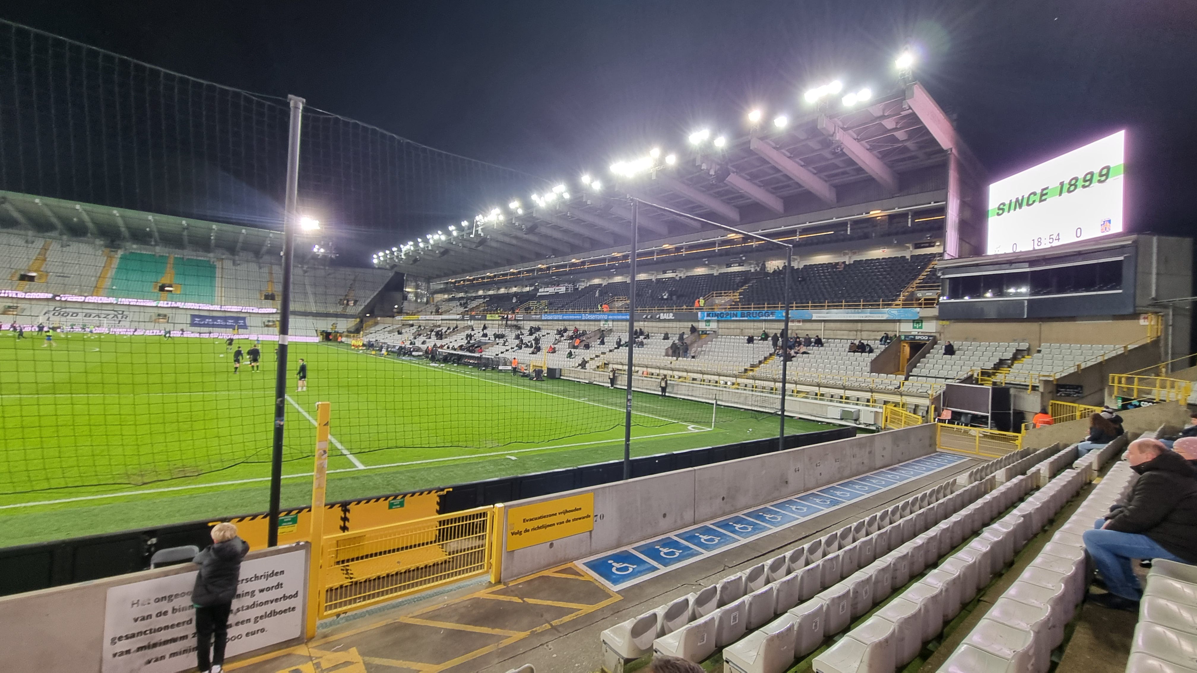 The Jan Breydel Stadion has seen better days. It looks like a concrete monolith. The main stand is divided into two very distinct halves. The dark blue and black of Club Brugges on one side; the green and black of Cercle on the other.