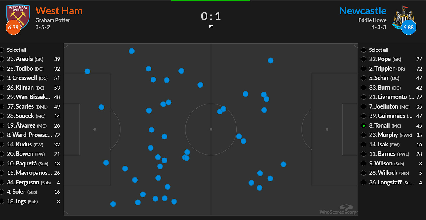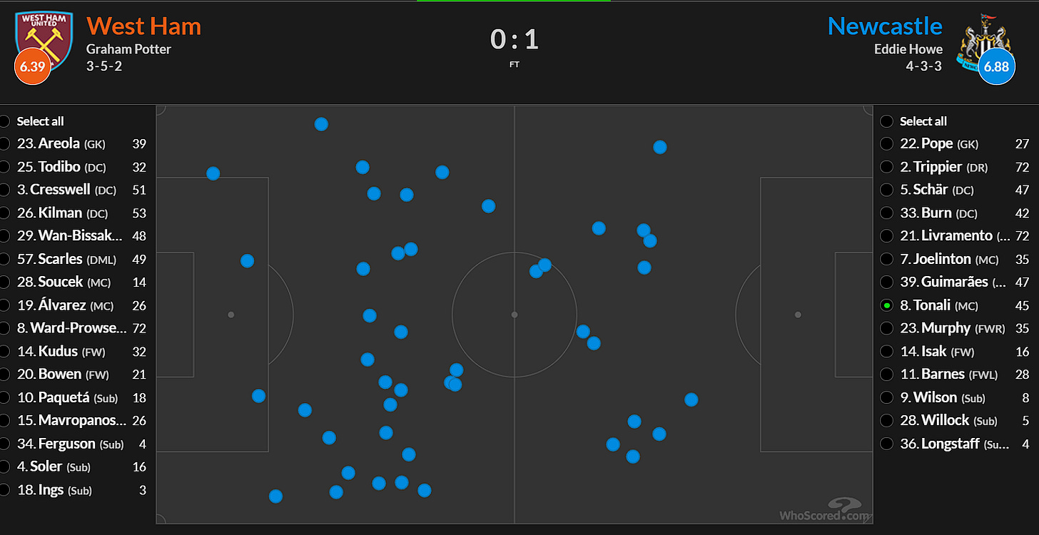 The second half was dominated by Newcastle as they carried on from their success at the end of the first half with their forwards probing constantly against a West Ham backline that looked extremely vulnerable throughout the whole game.