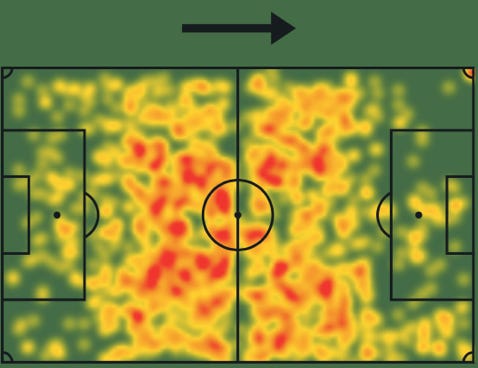 Tonali’s season heatmap highlights just how much ground he covers and that he does most of his work across the full width and length of the midfield third.